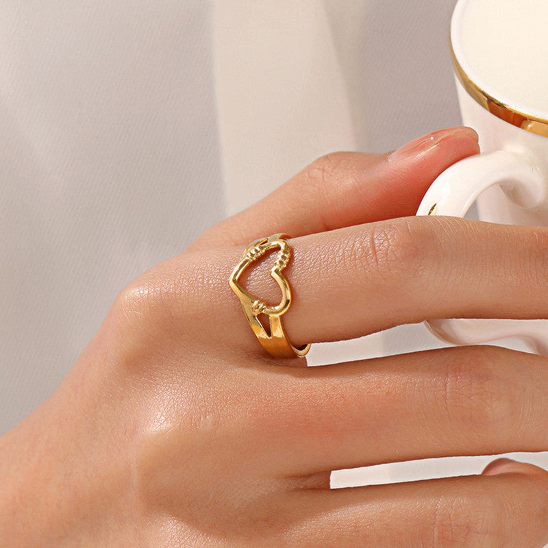Crafted from 316L stainless steel and finished with 18K PVD gold plating, this ring is both meaningful and luxurious. Each hand delicately holds a heart at the center — a reminder of affection, loyalty, and bonds that last.